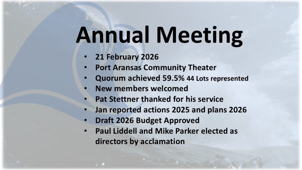 • 21 February 2026 at the Port Aransas Community Theater • Quorum achieved 59.5% – 44 Lots represented (13 in person and 31 by proxy) • New members welcomed (2025… Read More »2026 Annual Membership Meeting